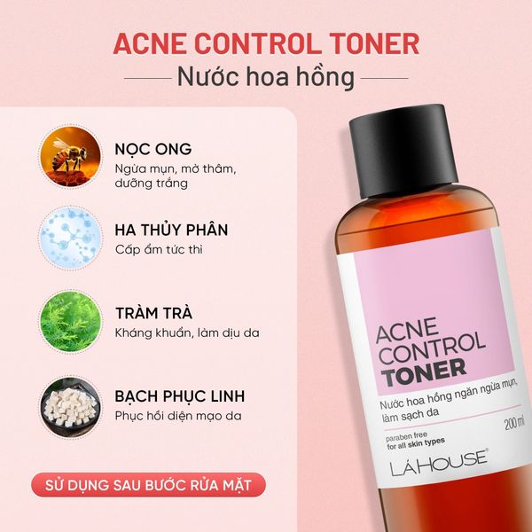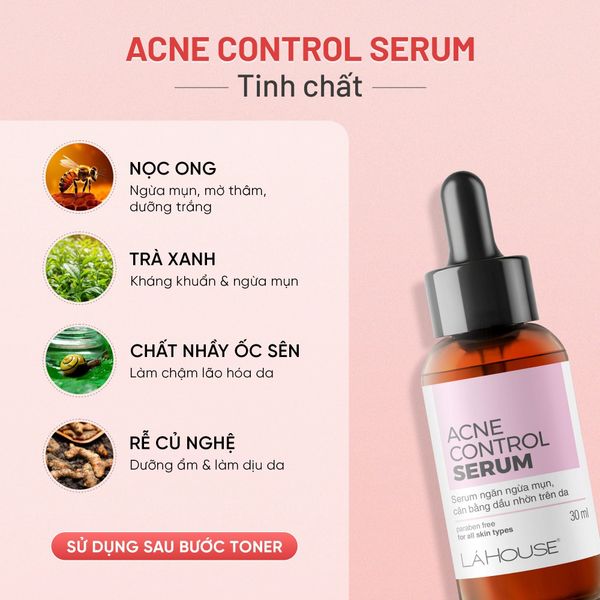 Acne Control Serum là bí quyết đến từ sự kết hợp hoàn hảo của các thành phần tự nhiên như Nọc ong, Trà xanh, Rễ Củ nghệ, Trái ổi, Táo đỏ, Chất nhầy ốc sên và Hoa hồng. Nọc ong hoạt động như một "kháng sinh" tự nhiên, an toàn và dịu nhẹ cho làn da mụn. Sản phẩm nổi bật với khả năng kháng viêm, giảm sưng mụn, gom cồi nhanh chóng, ngăn ngừa thâm sẹo và làm dịu làn da nhạy cảm.