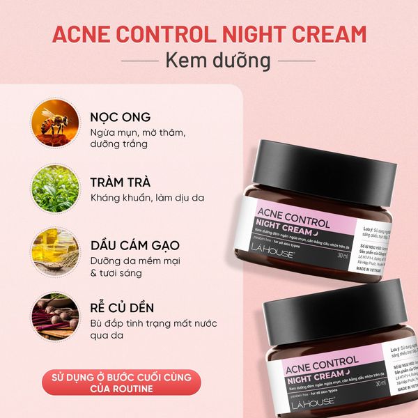 Sở hữu chiết xuất Nọc ong đắt giá cùng bảng thành phần giàu tiềm năng như Tinh dầu lá Tràm Trà, Dầu Cám Gạo, Lá Hương Thảo, Rễ Củ Dền… sản phẩm sẽ mang đến khả năng giúp ngừa mụn hiệu quả, mờ thâm nhanh chóng. Không chỉ giúp kháng khuẩn tối ưu mà kem đêm Acne Control Night Cream còn cấp ẩm sâu, cải thiện đàn hồi, giúp da sáng mịn, se khít lỗ chân lông hơn.